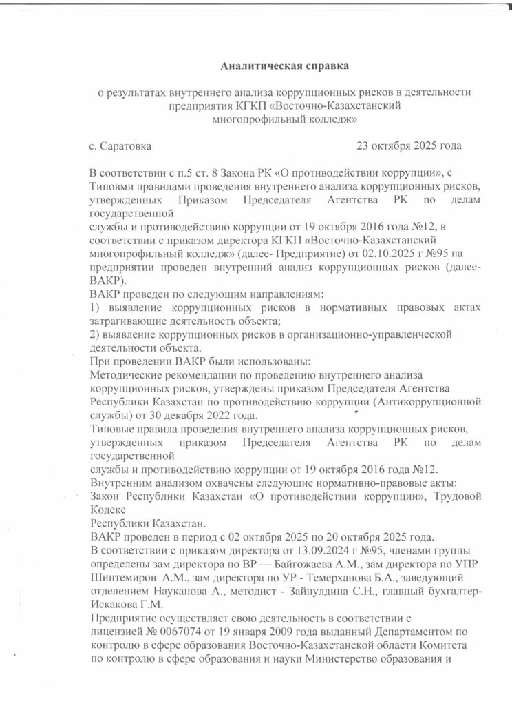1. Выявление коррупционных рисков в нармативно-правовых актах, затрагивающих деятельности КГКП «Восточно-Казахстанский многопрофильный колледжа» .