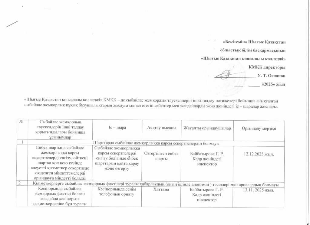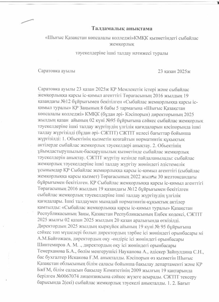 Анонс о публичном обсуждении результатов внутреннего анализа коррупционных рисков, проведенного в деятельности КГКП «Восточно-Казахстанский многопрофильный колледж»
